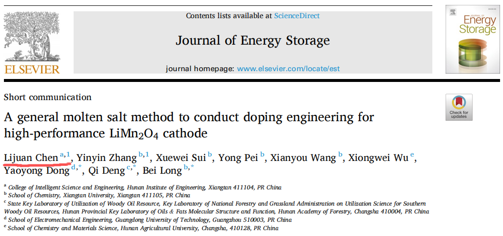 近日,我院陈丽娟博士以第一作者在国际知名期刊《Journal of Energy Storage》(中科院二区,影响因子8.9)上发表题为A general molten salt method to conduct doping engineering for high-performance LiMn2O4cathode的高水平研究论文。论文提出了一种普适性的熔盐法策略,实现了高性能锰酸锂(LiMn2O4)正极材料的同步制备与掺杂改性,为锂离子电池正极材料的结构稳定性和电化学性能提升提供了新思路。